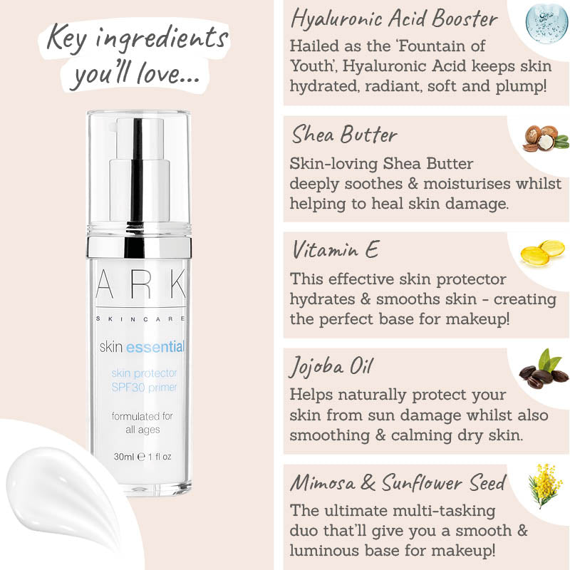 Wearing ARK Skincare Skin Protector, SPF 30 Primer can help protect against sun damage and accelerated ageing caused by the sun’s UVB and UVA rays (even on cloudy days and through glass windows!).