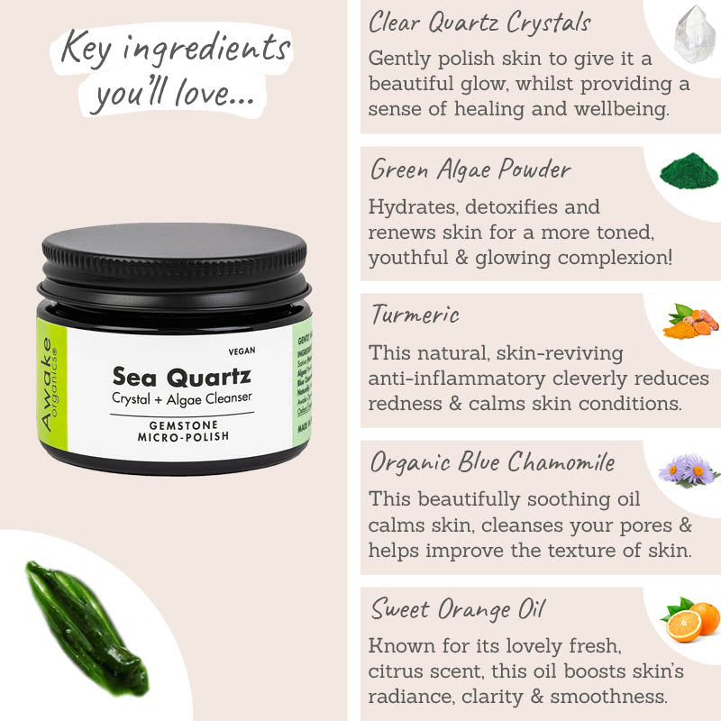The Awake Organics Sea Quartz Crystal & Algae Cleanser is packed full of powerful natural ingredients such as: